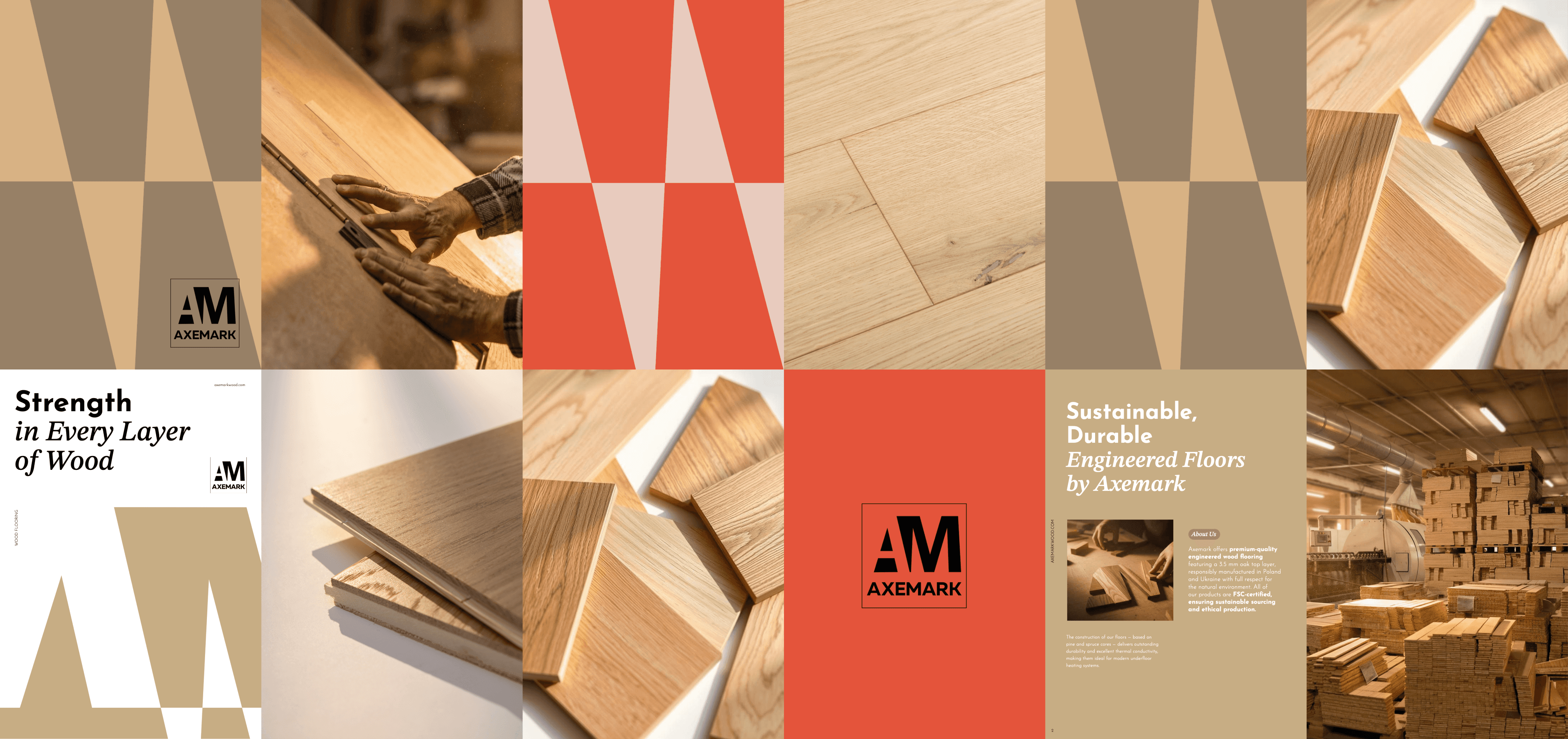 Dla marki AXEMARK zrealizowałam kompleksowy projekt obejmujący sesję zdjęciową oraz projekt katalogu produktowego przeznaczonego na rynki zagraniczne. Punktem wyjścia do pracy nad identyfikacją wizualną był logotyp marki, którego modułowa konstrukcja nawiązuje do układu desek i parkietu. Tę naturalną strukturę przeniosłam do projektu graficznego katalogu, wykorzystując ją w siatkach layoutów i rytmie kompozycji. Kolorystyka opiera się na naturalnych odcieniach drewna — beżach i brązach — uzupełnionych o akcent pomarańczowo-czerwony, który wprowadza energię i nowoczesny charakter. Część materiałów wizualnych została opracowana z wykorzystaniem narzędzi AI, co pozwoliło spójnie rozbudować świat wizualny marki. Głównym celem projektu było czytelne i uporządkowane zaprezentowanie oferty AXEMARK w kontekście międzynarodowym, z zachowaniem spójności, estetyki i funkcjonalności.